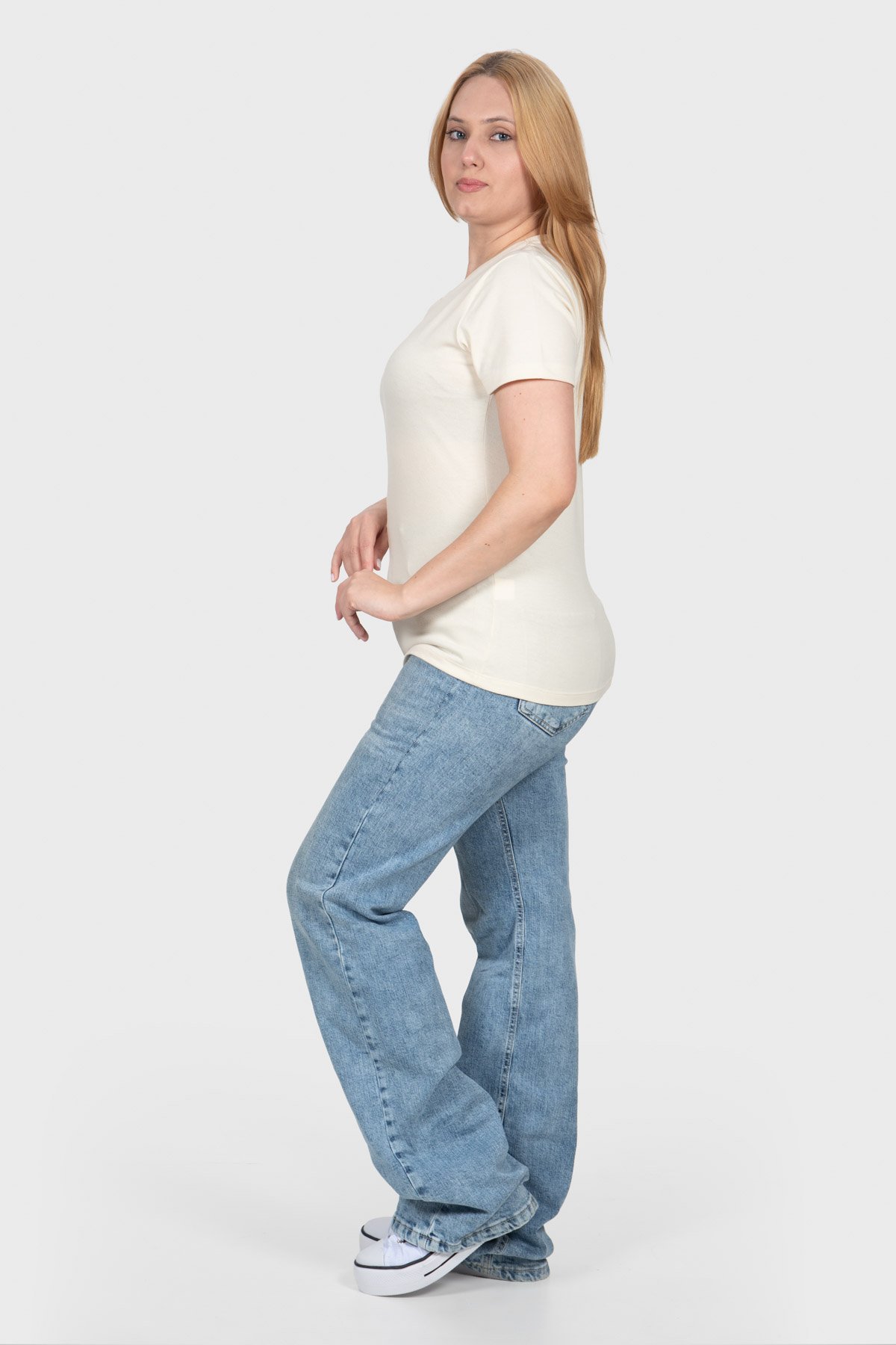 A Camiseta com Elastano Feminina combina 95% algodão para maciez e respirabilidade com 5% elastano para elasticidade e ajuste perfeito.